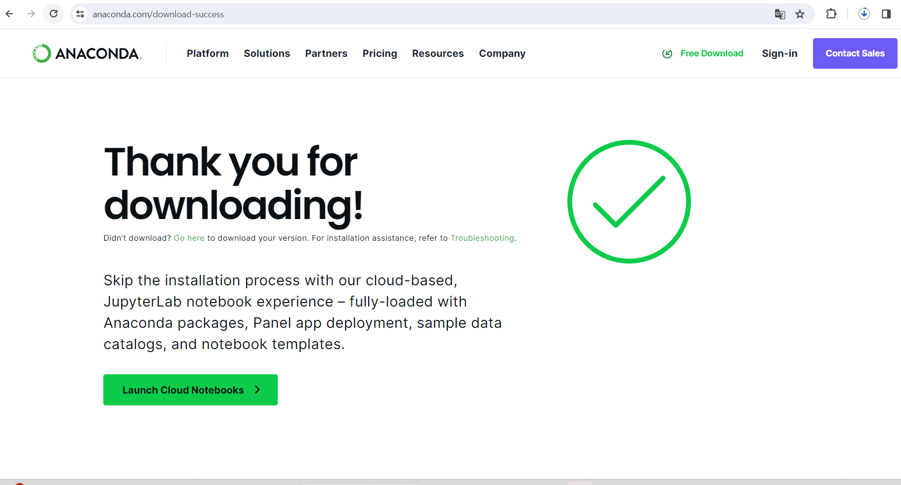 아나콘다 설치파일을 성공적으로 다운로드하게 되면 "아나콘다를 다운로드 해주셔서 감사합니다." 문구가 나타납니다.