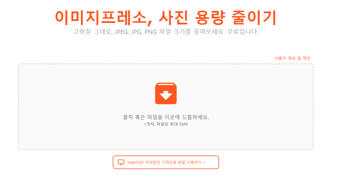 소개하고자 하는 사이트는 이미지프레소(Img Presso)이다. 이미지 프레소 사이트에 접속하면 이미지를 업로드할 수 있는 페이지가 출력된다. 주황색 점선박스 영역에 용량을 줄이고자 하는 이미지를 드래그 앤 드롭하면 이미지가 업로드된다.