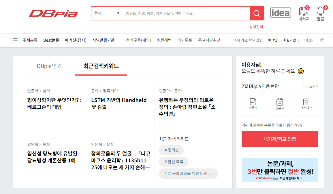 디비피아에 접속하게 되면 위 이미지와 같은 페이지가 나타난다. 상단의 빨간색 검색창에 논문을 조회하기 위한 키워드, 저널, 학회, 저자의 정보를 입력하면 된다.