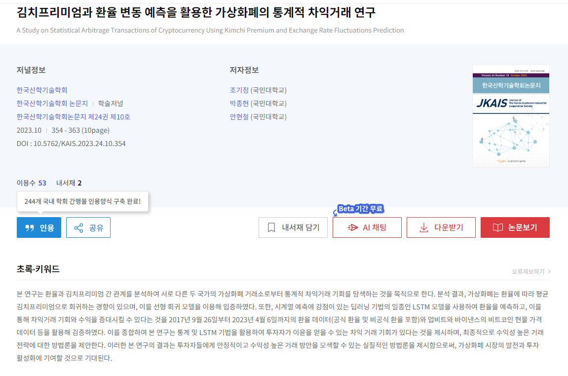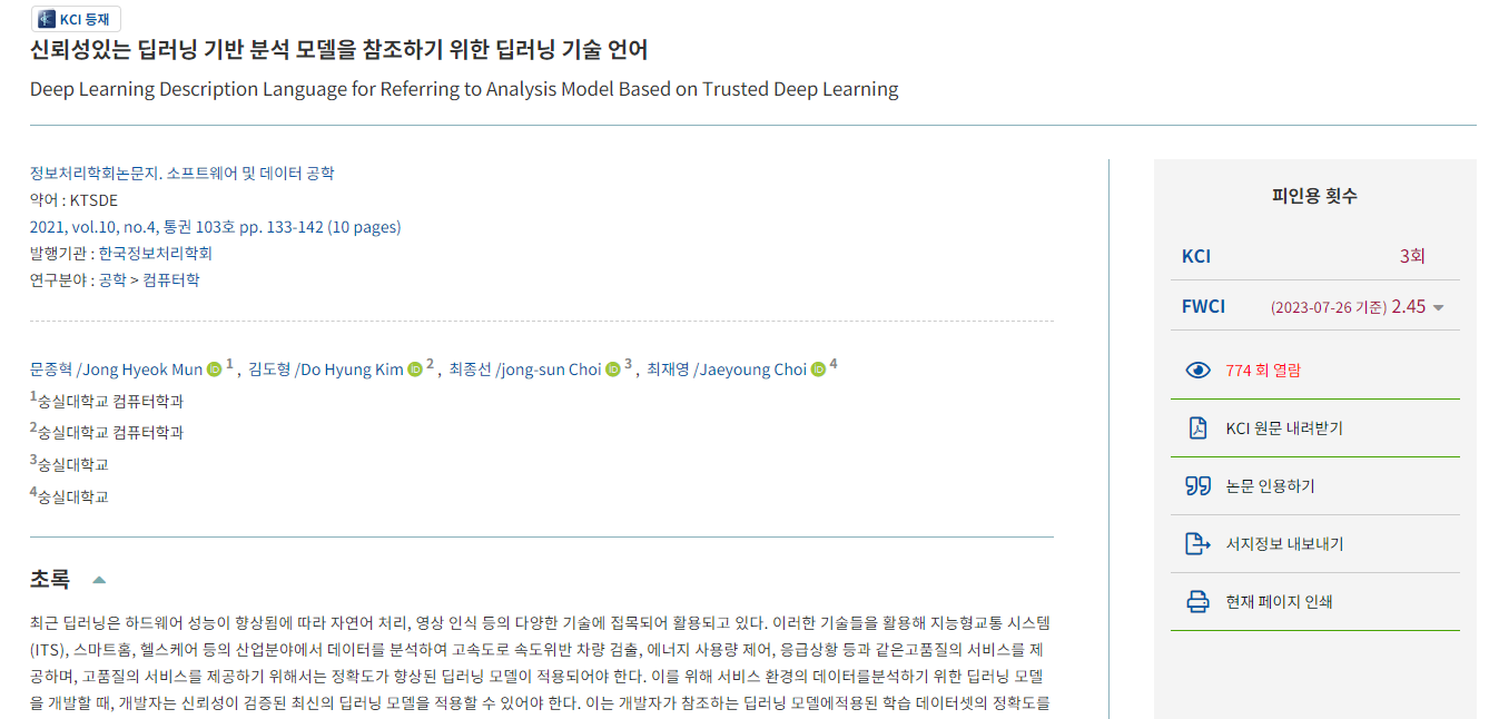 최상단에 위치한 논문의 정보를 조회한 결과이다. 저자명, 학회명, 투고 분야 등 여러 논문의 정보를 확인할 수 있다. 또, 논문의 원문을 다운로드할 수 있고, 인용하는 기능을 동일하게 제공한다. 대부분은 디비피아와 유사한 기능을 제공하지만, KCI 등재된 논문임을 표기하는 기능은 특별하게 제공한다.