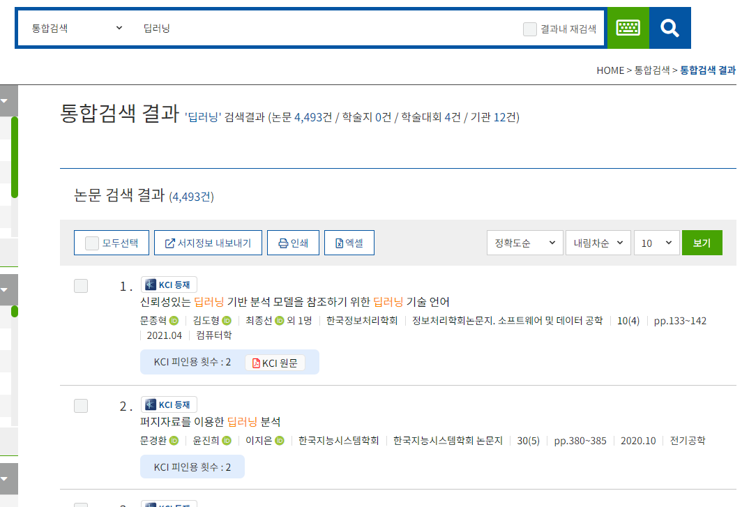 한국학술지인용색인 사이트에서 '딥러닝'키워드로 검색한 결과이다. 조회된 논문을 클릭하여 구체적인 정보를 열람할 수 있다. KCI에서는 조회한 검색결과를 엑셀로 저장하여 내보낼 수 있는 기능을 제공한다.