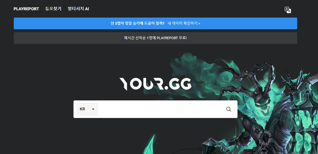 your.gg의 첫 메인화면이다. 화면 중앙부에 위치한 검색창에 자신의 롤 닉네임과 태그를 입력하면, 플레이어의 게임 전적 데이터를 바탕으로 분석한 결과를 볼 수 있다. 또한, 상단에 위치한 듀오 찾기로 같이 게임을 플레이할 수 있는 인원을 매칭하는 시스템을 이용할 수도 있다. 멀티서치 AI는 게임 내 챔피언 선택화면에 도입했을 때, "~님이 로비에 참가하셨습니다." 텍스트를 복사 붙여 넣기 하는 것만으로 팀원의 전적 데이터를 한눈에 볼 수 있도록 하는 기능이다.