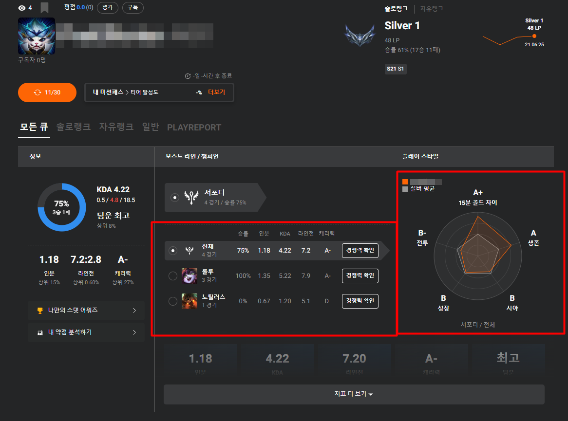좌측에는 플레이어의 최근 게임을 종합하여 라인전, 캐리력, 영향도를 평균 내어 나타내었다. 또, 나만의 스탯이나 약점을 분석하는 기능까지 추가적으로 제공하고 있다.