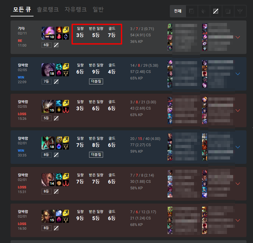 플레이어의 최근전적을 나타내는 화면이다. 딜량이나 받은 피해량, 골드 등의 지표를 그래프 형식으로 나타낸 타 플랫폼과 다르게 등수로 나타내었다. 지표들을 그래프로 나타내었을 때보다 자신의 플레이에 대해 상대적인 지표를 가시성 있게 확인할 수 있다. 지표들의 기존적인 배치나 표시는 타 플랫폼과 매우 유사하다.